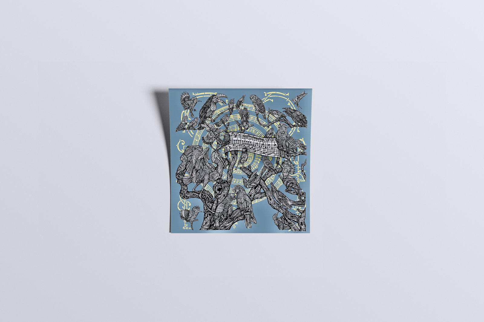 Croa, croa, cui-cui… Quelle cacophonie ? Que nenni ! Du corbeau au colibri, cette chorale aviaire s’accorde avec entrain autour d’une partition qu’ils sont les seuls à savoir déchiffrer. Concentrés sur les branches d’un arbre aux ramifications éparses, la volière se concerte pour occuper l’espace. Les plumages peu à peu se rabattent laissant place aux ramages, du gazouillis au caquetage. Cependant, point de dissonances car tous ne chantent pas de concert, la huppe se tait quand le geai s’égosille, la perruche s’interrompt quand le moineau pépie. On glousse, on jabote, on jacasse, on turlute… avec mesure. Alternant solo et tutti, on recherche la mélodie. C’est alors au hibou perché, hors de portée, de tenir le rythme. Mais ici l’harmonie est avant tout graphique. Tramé, ciselé, répété, le trait tend sa fine résille sur chaque élément, animal comme végétal. A l’aide de leurs pochoirs finement découpés, les MonkeyBird composent une œuvre unifiée, détaillée. Aux couleurs bigarrées des plumages variés, ils préfèrent l’équilibre d’un noir et blanc binaire, mettant au même niveau nos choristes zélés. L’œil circule ainsi d’un volatile à l’autre, prenant plaisir à en identifier l’espèce, par le seul jeu du trait et des références au vieux maitre flamand Frans Snyders, auteur prolifique de concerts d’oiseaux. Au centre enfin, tel l’astre solaire, un cercle doré enregistre les sons, les notes y font la ronde, la portée se fait disque. On se prend alors à entendre le Réveil des oiseaux d’Olivier Messiaen dont la partition reproduit leurs timbres, trilles ou tremolos. Dans cette œuvre lyrique, l’œil écoute.