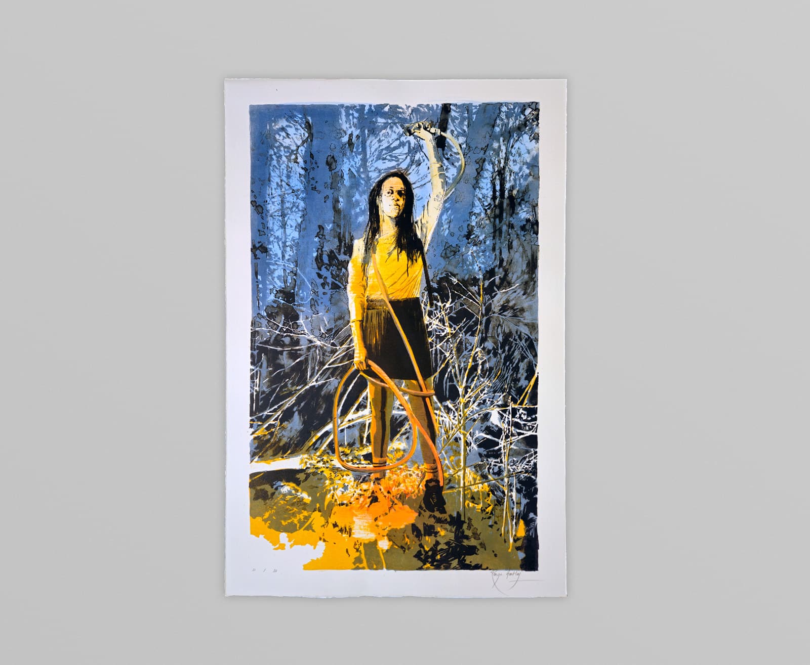 Pour qui est ce serpent qui siffle sur cette tête ? Bras gauche levé, comme suspendu, tête relevée, l’air éperdu, cette jeune femme se dresse au centre d’une végétation incandescente. Aux prises avec un tuyau d’arrosage qui l’enserre, ce Laocoon d’un nouveau genre affirme sa résistance et sa détermination à survivre dans une nature qui fulmine. Cherchant à éteindre un feu qui la consumera bientôt, elle brandit ce tuyau comme le symbole d’une lutte contre le réchauffement climatique et l’imminence de l’embrasement. Figure urbaine égarée dans une nature non domestiquée, sa présence incongrue accélère la tension entre deux univers tout autant délétères, unis par un destin commun. Embarqués dans une même tourmente, flore et faune cherchent désespérément à subsister de concert en dépit du brasier. Entre chien et loup, la nuit tarde à s’installer, freinée dans sa tombée par les couleurs de l’incendie. D’une touche fine et diffuse, Rouge Hartley brosse une végétation sauvage qui irradie de ses couleurs fauves paysage et personnage. Empruntant à l’impressionnisme, sa peinture prend sa source dans la photographie qui saisit son modèle originel dans une construction première. Vient alors la transcription au pinceau qui interprète la composition pour la sublimer, redonnant la primauté à la peinture et à la main. La brosse fusionne et agrège formes et couleurs dans un nouveau rendu pictural. Figurative et narrative, l’œuvre ainsi créée, oscille entre réalisme et onirisme tant par la facture que dans son message. Si elle reprend les codes de la peinture classique en campant son protagoniste au centre d’une composition parfaitement équilibrée, Rouge Hartley nous propose toutefois une nouvelle iconographie. Ni sainte ni déesse, son héroïne est l’incarnation d’une résistance solidaire de la Nature confrontée à l’actualité brûlante.